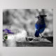 Original Foto von Steller Jay in Schwarz und Weiß mit der Jay und ein paar Blume in Farbe.