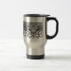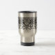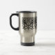 Schwarz-Weiß-Tasse mit aufwändig Viktorianischem Schablonendesign. Es gibt Bänder, Blätter, Wirbel, Kurven und Punkte. Mit all den verschiedenen Elementen, die in diesem Design zusammenarbeiten, denke ich, hat es letztendlich eine delikate, zarte Qualität.