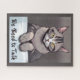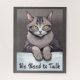 Puzzle in einer Illustration einer streng aussehenden grauen Tabbattkatze mit durchstechenden gelben Augen, die ihre Vorderpfoten auf einem Kamm ruhen und direkt nach vorne schauen, mit einer Luft von ernsthafter Autorität. Unter der Katze steht kühne Schrift: "Wir müssen reden" und fügt Spaß und Drama hinzu.