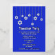 Chic Hanukkah Party Einladung in königsblau getan, mit Grafiken von hängenden Sternen von David in Silber-Folie und Silber-Folie angepassten Text. Personalisieren Sie den individuellen Text, auf der Vorderseite, um Ihre Feiertagsbedürfnisse Anzug.