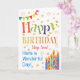 Eine farbenfrohe, textbasierte Geburtstagskarte für einen Step Son mit Polka Dot Bunting, hellen, gestreiften Geburtstagskuchen und vergoldeten Sternen. Der gemusterte Text sagt: "Happy Birthday" und es gibt auch "Habe einen wunderbaren Tag!" in blauer Schrift (NB die goldenen Effekt-Sterne und Konturen werden so gesehen und nicht in metallischer Tinte gedruckt).
