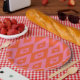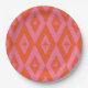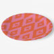 Das ist ein elegantes Retro-Sternexplosionen-Muster aus der Mitte des Jahrhunderts, das auf rosa und orangefarbenen Rautenformen errichtet wurde.