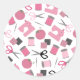 Un autocollant avec un design à thème de couture composé d'une machine à coudre, de bobines de fil, d'un coussin à épingle, de ciseaux, de nuances de tissu et d'aiguilles à coudre. Le design est assorti à des couleurs roses.
