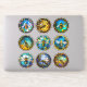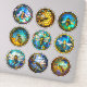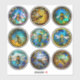Ce pack de 9 autocollants présente des abeilles au miel en verre et des peignes en miel dans les tons bleu, vert et or.