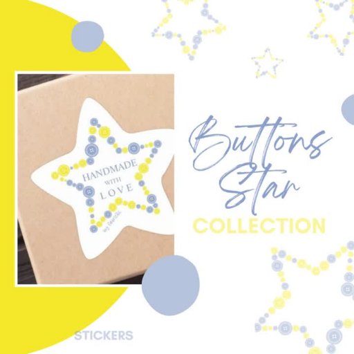 This sticker has been specially designed to complement the packaging of handmade items, including those inspired by button crafts and sewing. It appeals to artisans, sewing enthusiasts, and anyone looking to add a distinctive and personalized touch to their handmade products. The addition of the star-shaped design, created using a thoughtful selection of blue and yellow buttons, adds a touch of charm and originality to your packaging.