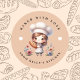 Cuisiné avec amour petite entreprise boulangerie autocollant personnalisé. Cute chef boulangerie tenant du pain frais.
