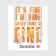 Je vais bien tout va bien. Cet accessoire de citation sarcastique est un cadeau parfait pour un homme ou une femme qui apprécie le sarcasme pendant ces temps difficiles. Un design idéal pour toute personne qui ne se sent pas bien et qui lutte avec l’anxiété ou la dépression. Un dicton motivant pour quelqu’un qui n’est pas en mesure de sensibiliser les gens aux problèmes de santé mentale. Si vous n’êtes pas d’accord, il est bon d’en parler! Fonctionne avec un arrière - plan motif incendie, fracturé, texte cassé avec un incendie & flammes.