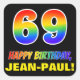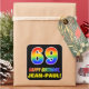 Ce sticker d'anniversaire joyeux, amusant et coloré comporte un grand nombre de "69" et le message "HAPPY BANTHDAY", tous deux avec un dégradé de arc-en-ciel coloré inspiré couleur motif, avec un nom personnalisé jaune gras. L'arrière - plan est noir de couleur. Des autocollants amusants peuvent être utilisés pour envelopper un cadeau ou un cadeau en l’honneur du 69e anniversaire de quelqu’un, ou peut-être être remis aux participants à une fête d’anniversaire. [~Z0000480]