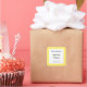 Une recette personnalisée ou un autocollant à bougie avec un script rétro bleu et noir et des lettres de bloc sur un motif contraint jaune et blanc. Ce modèle a trois lignes pour votre texte personnalisé, modifier pour ajouter ou supprimer des lignes, modifier des polices ou des couleurs arrière - plans !