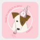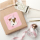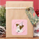 Ces autocollants de remerciement pour l'anniversaire du chien de la fille comprennent un modèle de Jack Russell Terrier, préparé pour un plaisir de fête d'anniversaire, portant un casquette de fête d'anniversaire rose, gris et blanc ondulé, avec un goûter et soufflant sur une corne de fête - arrière - plan rose pâle - personnaliser message de remerciement, nom de l'enfant et l'âge de l'enfant sur le casquette du chien - Jack Russell Terrier avec la conception de Tilt de tête © katz_d_zynes 2019