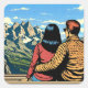 Mignons autocollants pour quelqu'un qui aime le randonnée et les montagnes. Un couple qui passe un moment romantique assis sur un banc regarde une vue pittoresque.