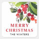Le design de l'autocollant de vacances présente une belle aquarelle de feuillage de Noël avec des feuilles verts et des baies rouges. Personnalisé Joyeux Noël avec un texte monogramme peut être personnalisé.