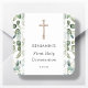 Célébrez la première sainte communion de votre enfant avec nos autocollants de faveur personnalisables avec un beau crucifix en or et un élégant feuillage d'eucalyptus sur un arrière - plan blanc immaculé. Nos autocollants ont des options de personnalisation facile, vous pouvez ajouter le nom de votre enfant et la date de l'événement.