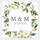 Conçus pour correspondre à notre collection de mariages en fleurs blanches, les autocollants carrés présentent vos initiales ou votre monogramme et date mariage encadrés dans une illustration de fleurs blanches et de feuilles verts.