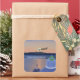 Cet autocollant de Noël présente le Père Noël survolant Santorin, en grec.