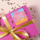 L'autocollant de remerciement rose "Merci" est un ajout amusant pour une soirée de bachelorette avec le nom de la future mariée en dessous. Le fond est coloré avec des palmiers bleus, jaunes et roses.