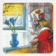 Aquarelle vintage aux couleurs vives. Une petite fille en robe rouge et le bonnet regarde un vase d'iris assis sur la table. Beaux-arts du peintre suédois Carl Larsson.