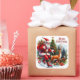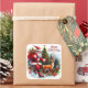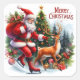 A joyful Santa Claus is seen ice skating alongside a cheerful reindeer. The festive backdrop includes a beautifully decorated Christmas tree and colorful gifts, creating a delightful holiday atmosphere filled with cheer and celebration.