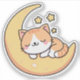 Design d'autocollant mignon et capricieux avec un chat kitty orange et blanc dessiné dormant paisiblement sur une lune au croissant jaune vif. L'arrière - plan est un ciel bleu apaisant, orné de trois étoiles jaunes brillantes. Parfait pour les amoureux de les chats, ce design adorable capture une atmosphère rêveuse et cosy.