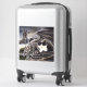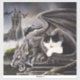 Un chaton smoking noir et blanc est assis à côté d'une gargouille. Derrière eux se trouve un château et des dragons.