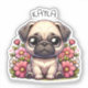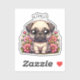 Cute chibi dessin douillet petit chien chiot carlin assis dans des fleurs roses avec un nom que vous pouvez ajouter dans l'espace personnalisé.