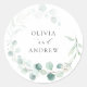 Scellez vos enveloppes d'invitation ou vos faveurs avec ces autocollants de mariage botaniques classiques. Avec vos noms encadrés par une couronne d'aquarelle de feuillage vert d'eucalyptus. Customisez avec des noms.