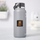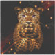 Eclipse Majesty, présente un léopard à la fourrure dorée et des taches distinctives, dressé contre un arrière - plan sombre. Les yeux du léopard sont illuminés de violet vif, créant un effet mystique et frappant. L'environnement sombre est accentué par des lumières éparses et chaudes, donnant à la scène une atmosphère dramatique presque insolite.