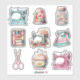 Ce pack de 9 autocollants présente de belles illustrations d'aquarelle d'éléments de couture vintages. On y trouve des machines à coudre, un broyeur, un bocal à boutons, une boîte contenant des bobines de fil, du fer, des ciseaux à coudre et un coussin.