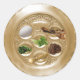 Plaque de séder de Pâque avec les 6 symboles sur un autocollant rond.