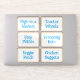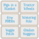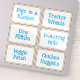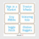 Baguettes de table de fête d'anniversaire à thème de la ferme. Une feuille de six autocollants à customiser avec votre choix de texte dans une police amusante en bleu. Décrivez l'aliment servi et donnez-lui un air de ferme, comme des pattes de vache, des nuggets de poulet, des pattes de légumes et des cochons dans une couverture. Ou, utilisez des descriptions simples, en une ou deux lignes. La taille de chaque autocollant dépend de la feuille de taille commandée. Cette feuille est de 8x8 pouces, donc chaque autocollant sera d'environ 3,5 x 2,5 pouces (ce n'est pas exact).
