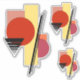 Un triangle noir divisé en segments, une bande trapézoïdale noire divisée en deux, un cercle rouge, un rectangle jaune, un carré rouge pâle, un cercle pourpre, et un carré orange sont des éléments de cet art abstrait de formes imbriquées par Richard H. Fay.