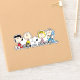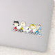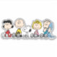 Regardez Lucy, Charlie Brown, Snoopy, Sally, et Linus assis ensemble dans une rangée.