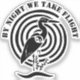 Une Grue noire debout dans l'eau fait dans un hybride de silhouette et de style pochoir. La Grue est entourée d'une spirale noire et blanche qui se concentre sur un design de yang qui coule au coeur, le symbole est partiellement enfoncé pour représenter le début du crépuscule. La jambe arrière est levée, montrant deux talons, et l'autre jambe se fond dans l'eau. Deux plantes sombres s'élèvent hors de l'eau, les feuilles sont noirs. Avec le texte changeant qui dit "Par nuit nous prenons le vol"