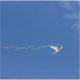 Une photo d'un cerf-volant coloré d'oiseaux macaw avec des rubans flottant dans le vent venant de ses ailes, volant haut dans le ciel bleu d'été. Copyright photo ©Kimberly J Tilley.