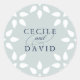 Scellez vos enveloppes de faire-part de mariage, faveurs et plus encore avec nos élégants stickers d'inspiration marocaine en menthe douce et marine. Le design rond présente vos noms reliés par un script décoratif et entourés d'une bordure géométrique en blanc sur un arrière - plan bleu-vert éthérée. Coordonnées avec notre collection de faire-part de mariage arabesques à Mist.