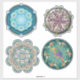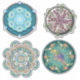 Quatre mandalas exquis dans différents styles, tropicaux, marbre, gaufré et métal émaillé bleu.