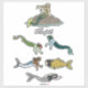 Cette illustration présente un éventail de merfolk du monde entier. Les êtres représentés comprennent : une sirène du nord de l'Europe aux cheveux blonds, un merrow mâle aux carreaux rouges de lore irlandais, un havmand danois à la peau bleue, une bonite portant un collier des traditions du peuple Sa'a des Îles Salomon, un ningyo japonais à visage humain et un kaaiman aux yeux rouges d'Afrique du Sud.