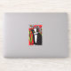 Cet autocollant en vinyle a un chat tuxedo noir et blanc avec les yeux verts assis devant des marguerites blanches avec des feuilles verts sur un arrière - plan rouge vif.