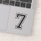 Numéro sept autocollant. Police du collège sportif en noir. L'alphabet complet et les numéros 0-9 sont disponibles.