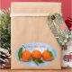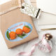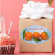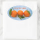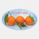 Vue rapprochée d'une ligne de trois agrumes de mandarine aux feuilles verts, et gouttes d'eau sur la peau. Arrière - plan bleu texturé. Contraste des couleurs orange, verte et bleue. Autocollant ovale. Vous pouvez modifier ou supprimer le texte modèle.