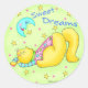 Le chat qui dort fait ce que les chats font le mieux - la sieste. Cet autocollant coordonne avec la papeterie et l'invitation. Elle porte un adorable top rose avec des étoiles et des manches à rayures aqua. La lune est suspendue au-dessus du chaton endormi, regardant par-dessus le sourire. Kitty a aussi un sourire béant pour que vous sachiez qu'il a de doux rêves. Le texte de "Sweet Dreams" est sur un arrière - plan vert citron parsemé d'étoiles jaunes et de points roses. L'image est entourée d'une bordure brillante et colorée. Ce chatte jaune est l'un des 10 chats de la collection de tissus "Meow Meow" de Phyllis Dobbs.