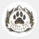 badge circulaire vintage avec un empreinte de patte audacieux avec des pics montagneux et des pins à l'intérieur. Parfait pour les randonneurs, les campeurs, les amoureux de les chiens et les explorateurs extérieurs. sticker vinyle durable, imperméable et idéal pour les ordinateurs portables, les bouteilles d'eau et le matériel de voyage.