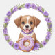 Joyeux chiot avec un beigne. Fleurs violettes, mignonnes et amusantes !