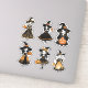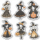 Embrassez l'esprit d'Halloween avec cette charmante série de 6 autocollants, chacun présentant une adorable petite sorcière dans diverses poses fantaisistes. Parfait pour ajouter une touche de magie à votre papeterie, artisanat ou faveurs de fête. Ces jolies sorcières vectorielles sont ornées de robes en forme de citrouille, rehaussées d'arabesques complexes en or noir, blanc et glitterie, ce qui en fait un joli complément à toute collection Halloween.