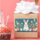 Lapin blanc mignon avec un fond de fleurs et des œufs de Pâques de chaque côté du lapin