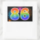 Cette conception d'autocollant amusante et vibrante présente un motif coloré inspiré de feux d'artifice de célébration, ainsi que le nombre "86" ayant un motif de dégradé inspiré d'un arc-en-ciel multicolore, sur un fond de couleur noire. Des autocollants comme celui-ci pourraient peut-être être offerts en petit cadeau lors de la célébration du quatre-vingt-sixième anniversaire de quelqu'un, ou peut-être pour un quatre-vingt-sixième anniversaire de mariage de couple, ou un autre événement 86. [~Z0000324]