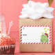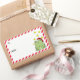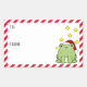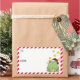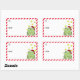 Étiquettes de Noël amusants pour vos cadeaux. Une grenouille verte heureuse portant un chapeau de Père Noël rouge et blanc et entourée d'étoiles jaune vif est assise sur la droite. Sur la gauche, il y a des espaces pour ajouter l'info de et vers et une bordure en diagonale rouge et blanche.