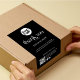 Customisez ces minimalistes noirs "Livraison Logo QR Code Merci Black Box Seal Étiquettes" pour l'emballage d'entreprise, avec un logo de société blanche, le message "Merci pour votre commande" dans une typographie ligature moderne, votre message personnalisé, QR Code, et les poignées de médias sociaux (Instagram, Facebook). Les autocollants sont destinés à passer verticalement sur le couvercle de la boîte d'emballage. Veuillez contacter le concepteur du magasin pour plus de personnalisation si nécessaire.