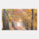 Un autocollant photo rectangulaire des rayons de lumière créés par les rayons de soleil à travers le feuillage d'automne des arbres le long d'un chemin à travers une forêt dans le brouillard matinal en automne.