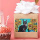 Chat noir expressif, capricieux, tournesols colorés et feuilles verts dans les couleurs jaune et bleu turquoise. Peinture acrylique originale artistique et vibrante sur panneau en bois par Bulgan Lumini (c)